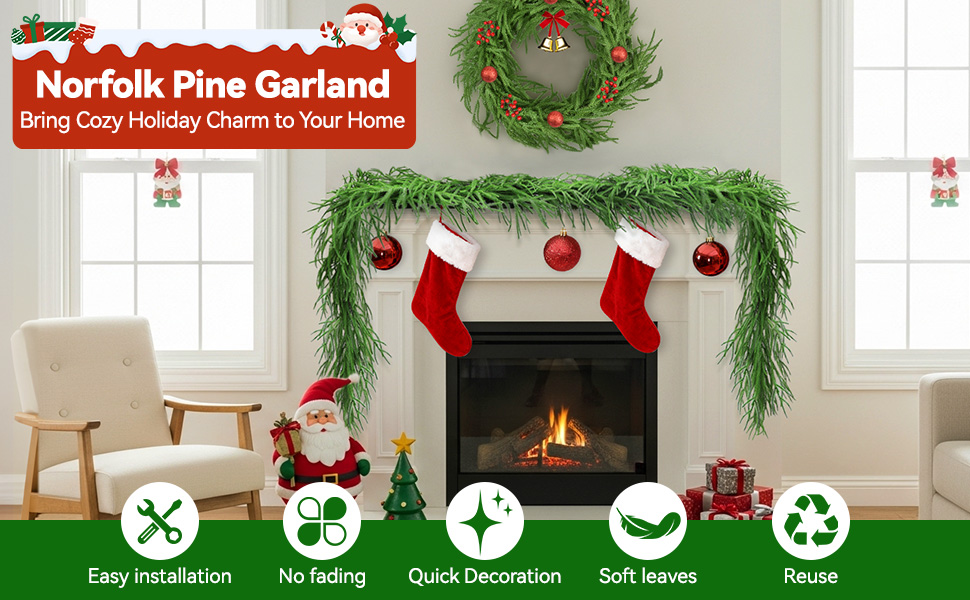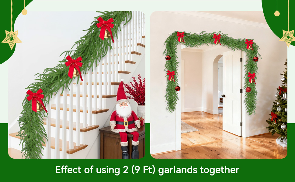Christmas Garland, 9FT Artificial Norfolk Pine Garland, Real Touch Pine Garland, 96 Branches Christmas Garland for Mantle, Staircase, Banister, Indoor, Outdoor Christmas Decorations