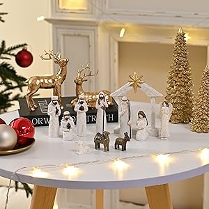 The modern nativity set, including 11 figurines with their own features to indicate identity, which is a vivid scene reappear of the holy birth of Baby Jesus, is an adorable addition to your Christmas festival decor, adding a touch of elegant and warm vibe to your home decor and bringing a sense of coziness and warmth into your heart.