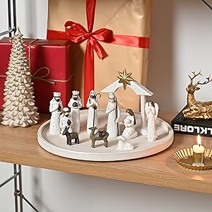 Place the mini nativity set on the decorative trays, giving full play to your decorating imagination.